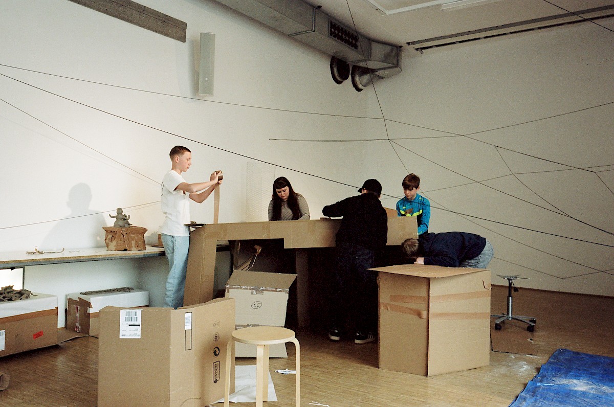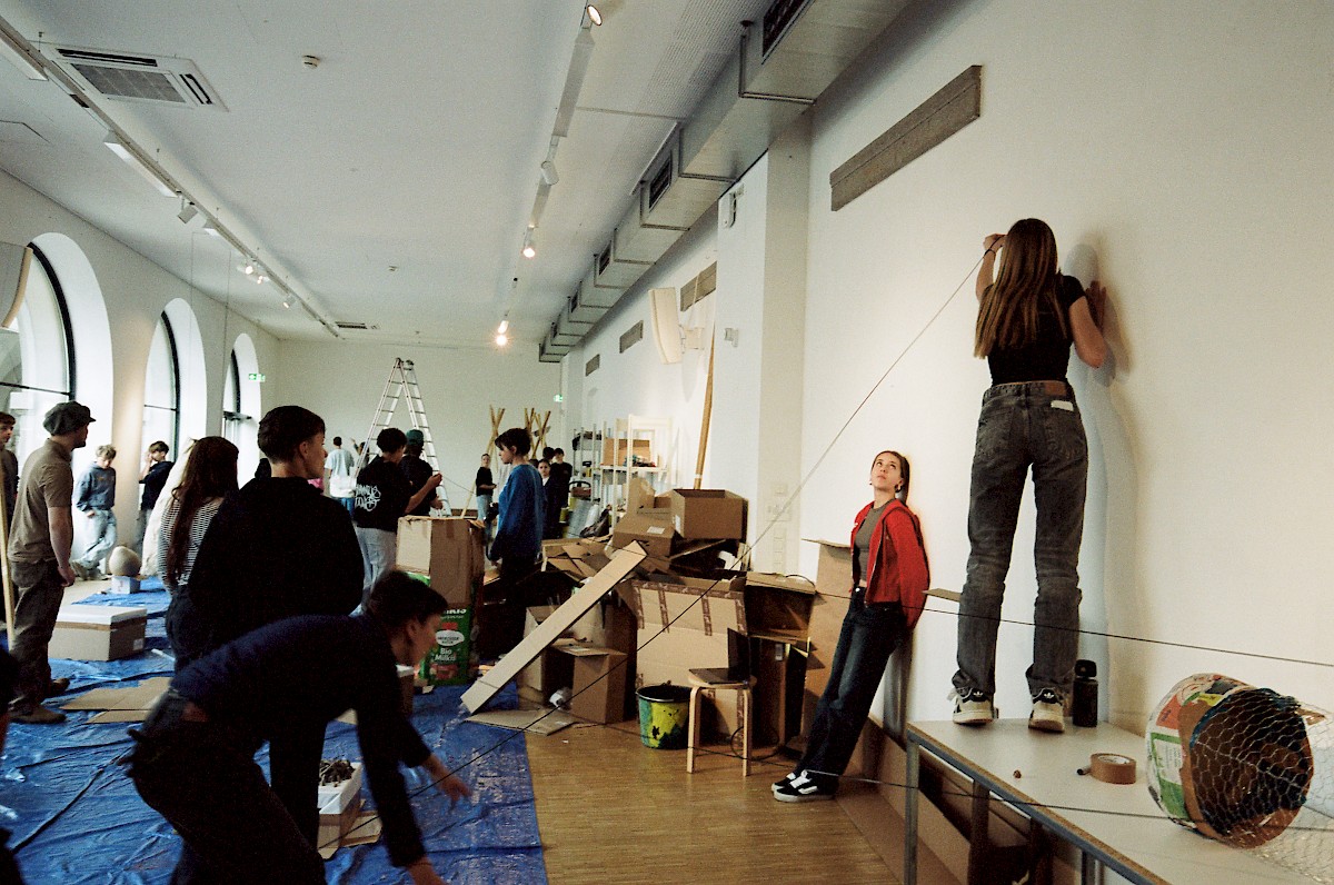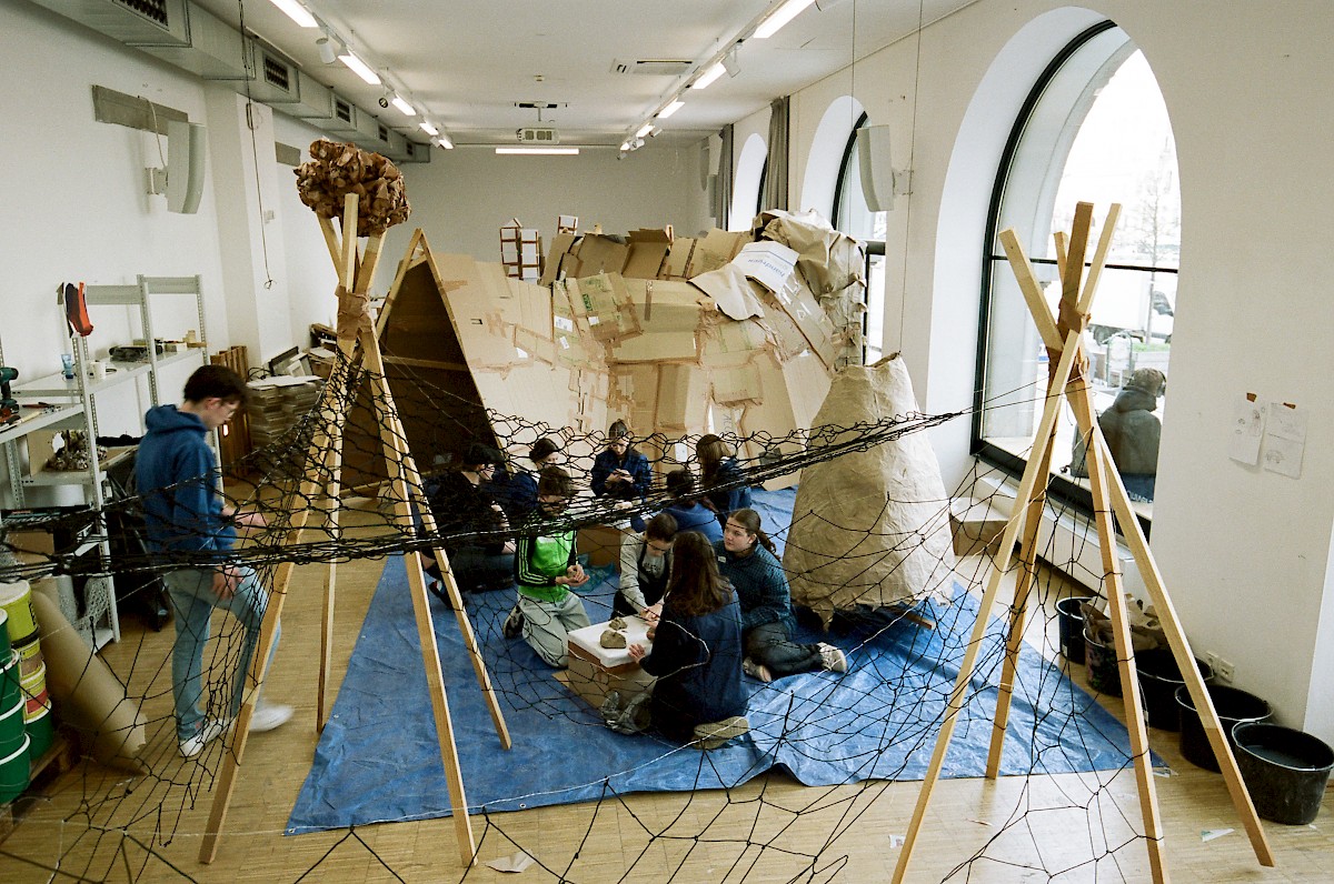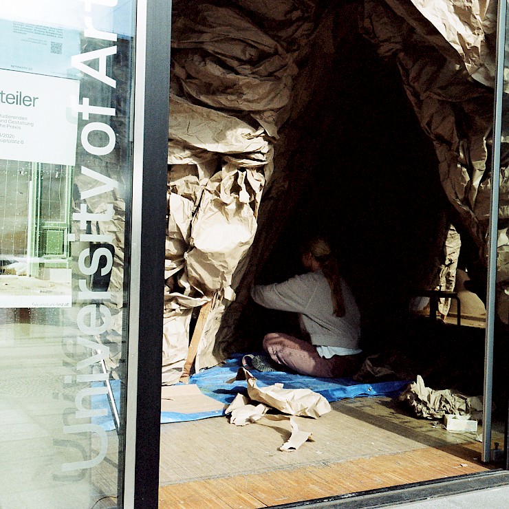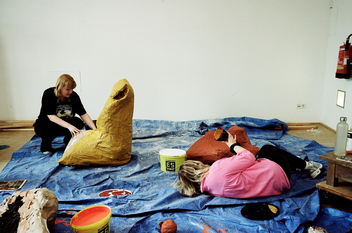 Gemeinsam verbrachten die Studierenden einige Tage im Splace, arbeiteten in kleinen Gruppen mit vorgegebenen Materialkontingenten. Nach einer Ausstellung am 11.04. wurden die Skulpturen zum Teil bei einer Parade in Gedenken an feministische Landverteidigerinnen zu öffentlichen Raumteilern umfunktioniert.